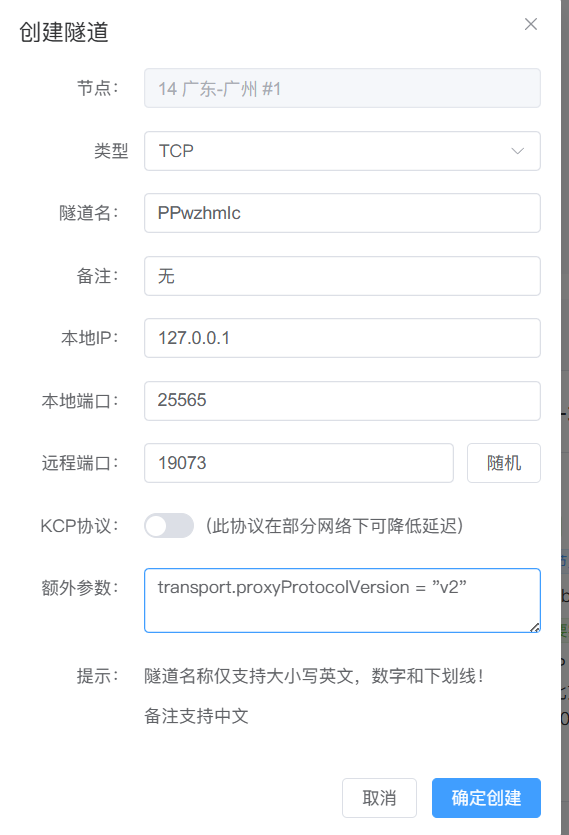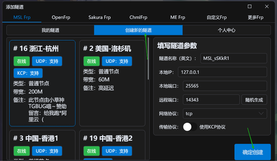 进入创建隧道选项卡,选择就近的节点,填写相应的参数(如果不懂,那就不要改就好啦)。KCP