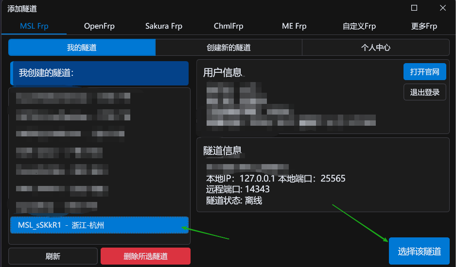 创建隧道后,选择你创建的隧道,点击选择该隧道